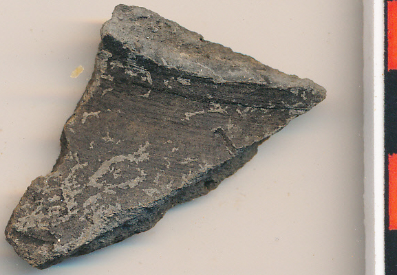 Sötétszürke, homokos anyagú, korongolt fazék íves nyaktöredéke bekarcolt dísz indításával két helyen.