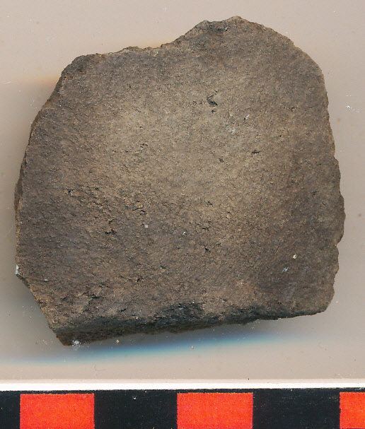 Fekete külső felületű, szürke törésű, homokos anyagú, korongolt edény oldaltöredéke a vágott alj indításával.