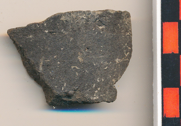 Fekete, homokos anyagú, korongolt edény kicsit vastagabb oldaltöredéke.