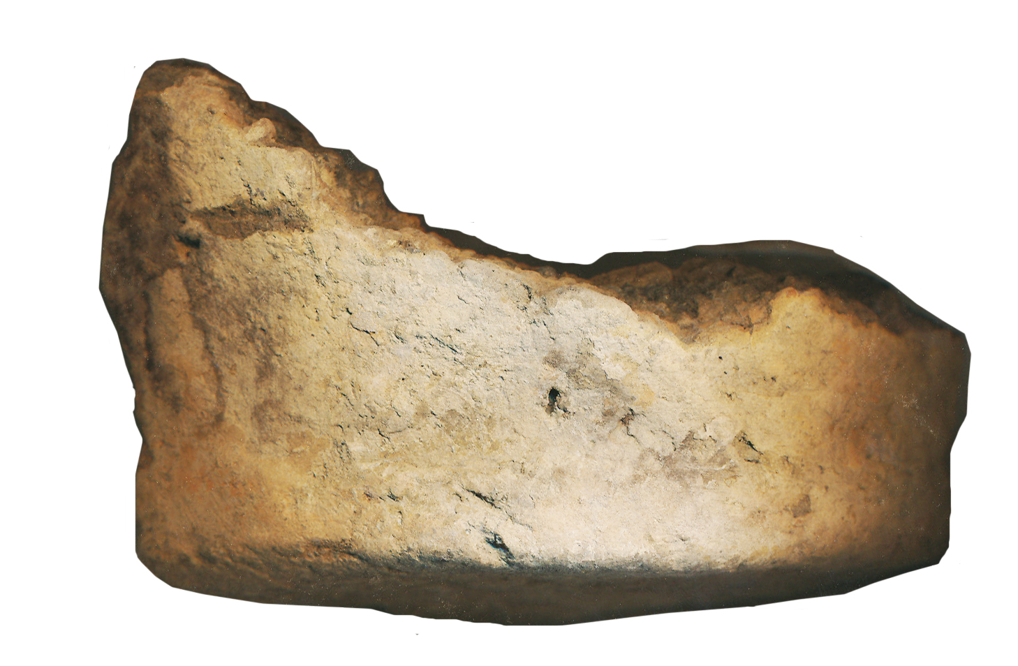 Szürkés téglaszínű külső-belső felületű, fekete törésű, korong nélkül készített, kerámiazúzalékkal soványított kisebb edény vastag falú vágott alja a felmenő fal indításával.