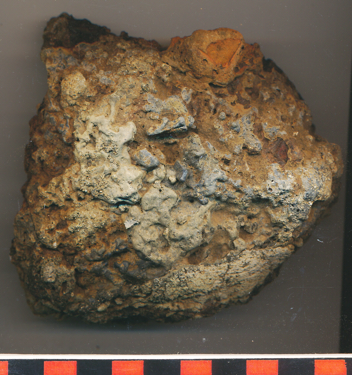 Szabálytalan alakú, üveges feketére égett, barna, rücskös felületű, kissé omlékony nagy salakdarab.