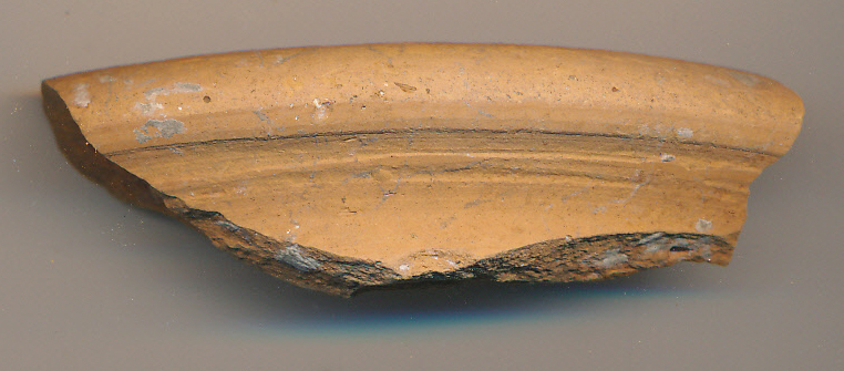 Téglaszínű, korongolt, gyűrűsen kihajló perem, felülről sekély barázdával tagolt.