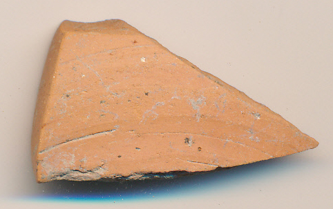 Téglaszínű, kívül simított, korongolt, vékony falú edény oldaltöredéke, melynek egyik törésfelületét simára csiszolták.