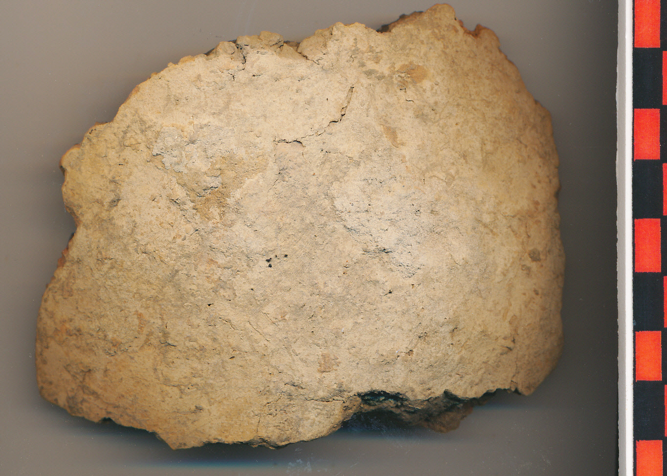 Világos téglaszínű külső felületű, fekete törésű, kerámiazúzalékkal soványított nagyobb, korong nélkül készített edény vastag falú, íves oldaltöredéke.
