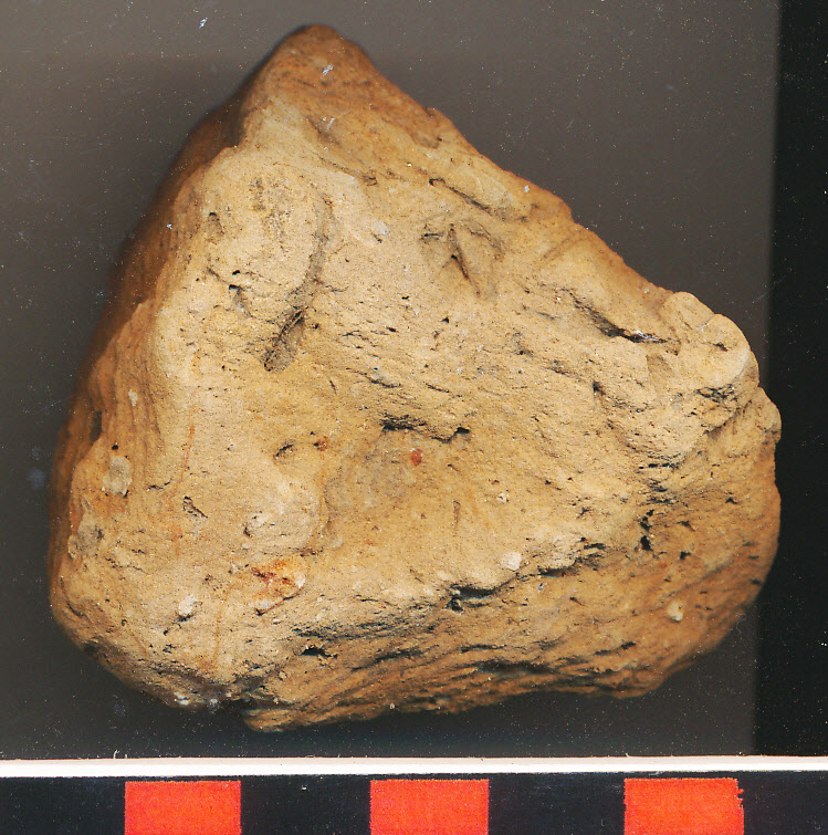 Szabálytalan alakú, homokos anyagú, morzsolódó, téglaszínű, kopott paticsdarab.