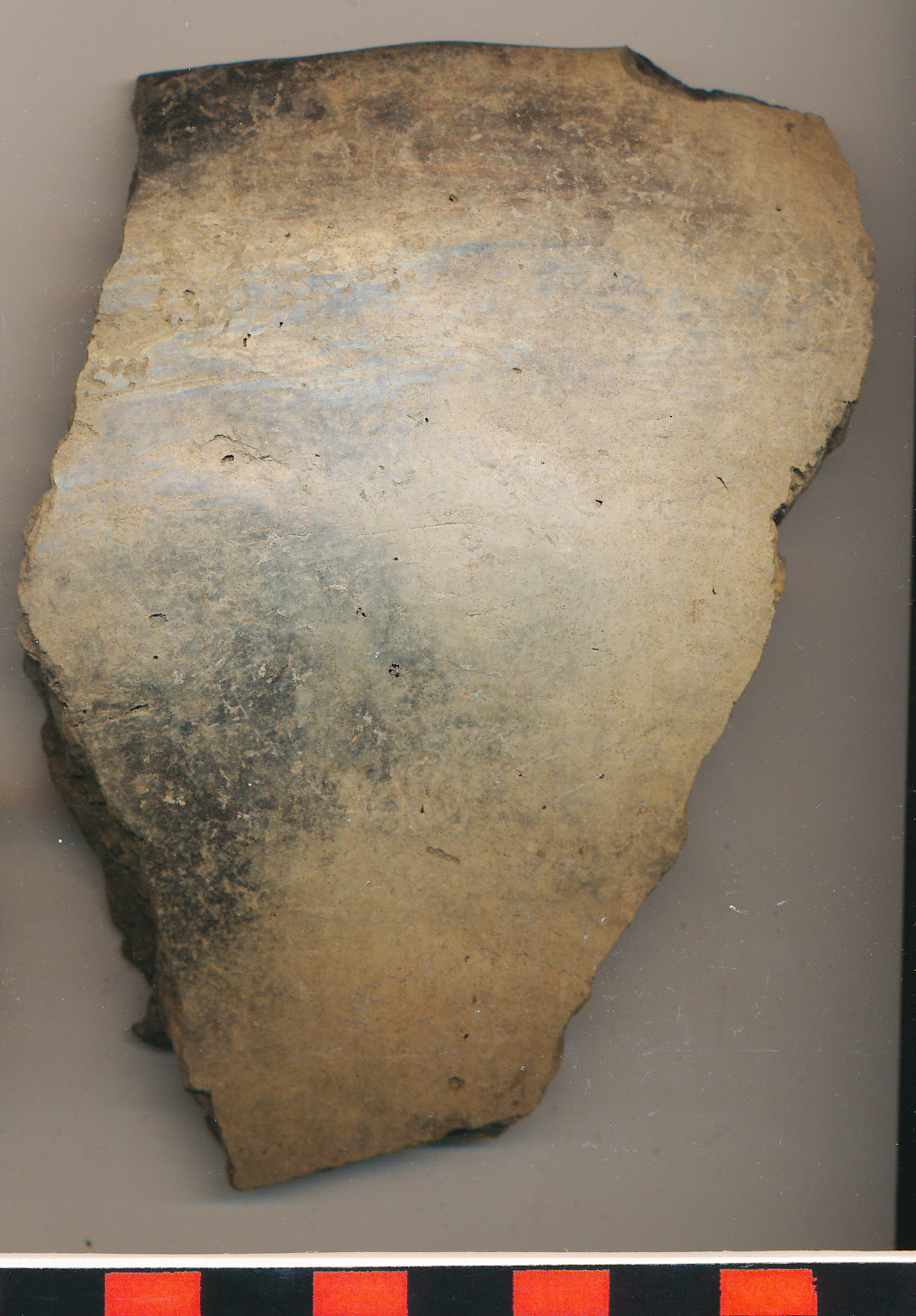 Fényezett, fekete foltos sárga külső felületű, fekete törésű, belül fényezett fekete, kerámiazúzalékkal soványított félgömbös tál kissé elvékonyodó pereme.