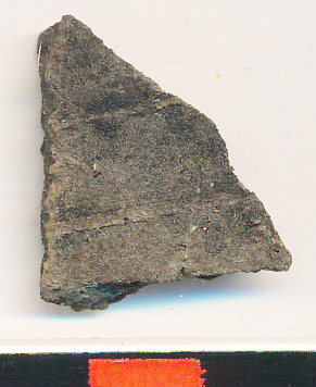 Fekete, homokos anyagú, korongolt edény oldaltöredéke 2 körbefutó szélesebb behúzott vonallal.