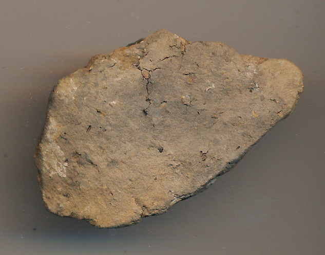 Szürke külső felületű, fekete törésű, korong nélkül készített, erősen kopott oldaltöredék.