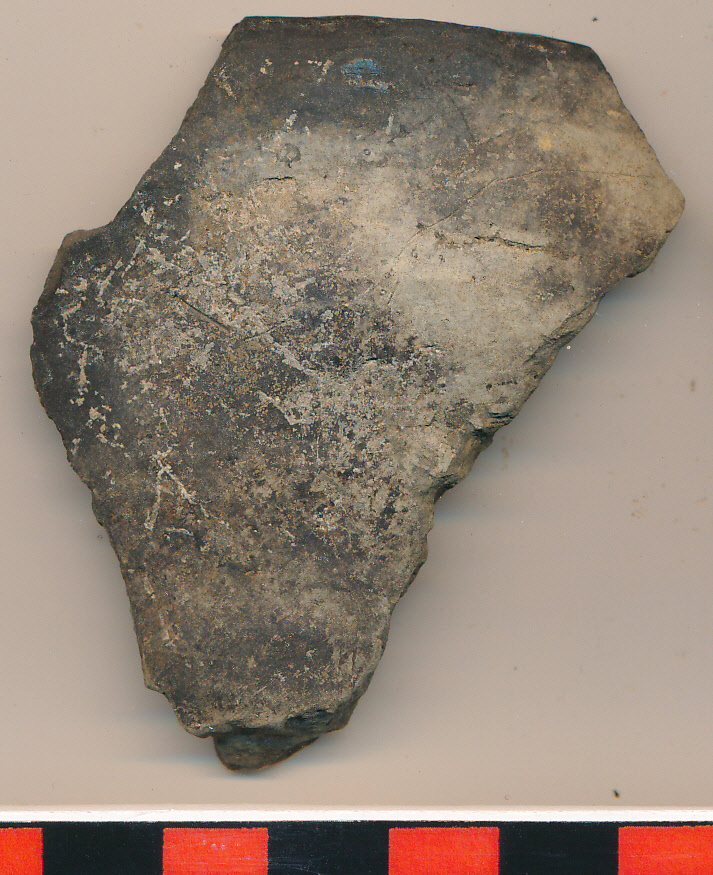 Belül fényezett, kívül kicsit durvábban kidolgozott, fekete, külsején szürke foltos, nagyon kevés kerámiazúzalékkal soványított anyagú tálka turbántekercses pereme.