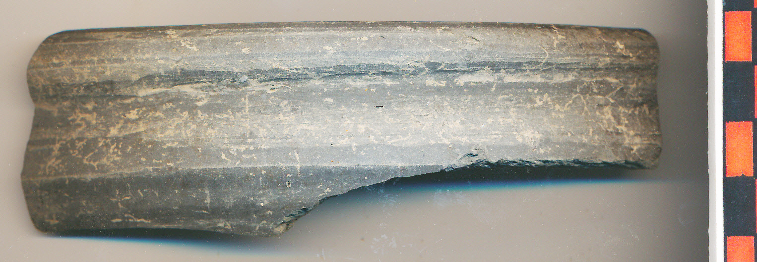 Sötétszürke, korongolt, duzzadt peremű, éles válltörésű, kívül-belül vízszintesen simított lapos, vékony falú tál peremtöredéke.
