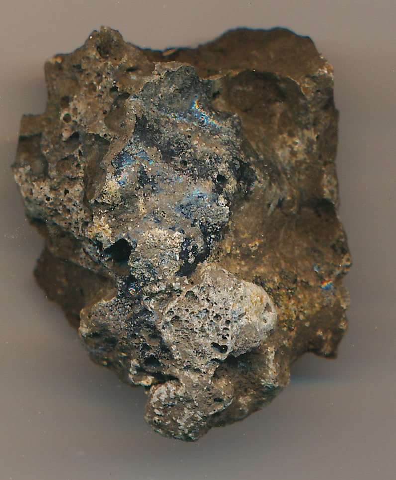 Szabálytalan alakú, szürke, üveges-hólyagos-szivacsosra égett nehezebb kis salakdarab.