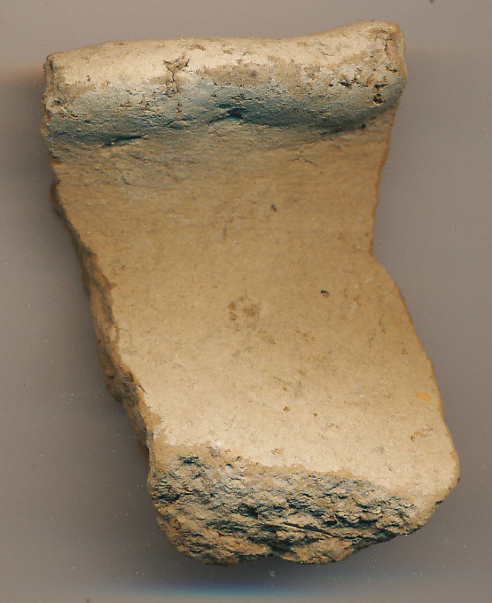 Sárga, kevés kerámiaszemcsével soványított, eldolgozott felületű, korong nélkül készített edény kihajló, kissé elvékonyodó pereme, vastagodó, íves vállal.