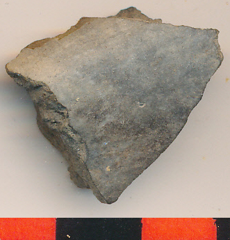 Kívül-belül fényezett felületű, sötétszürke kis edény íves kis oldaltöredéke.