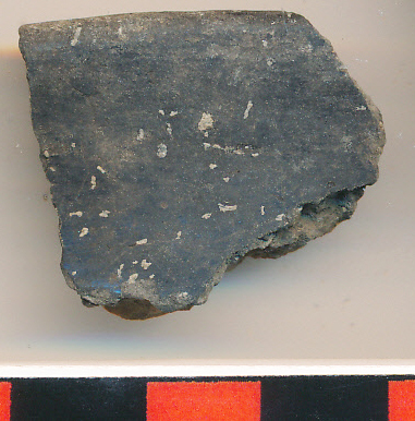 Világosszürke, külső felületén fényezett fekete, kisebb, vékony falú edény enyhén íves nyakú, elvékonyodó peremű töredéke.