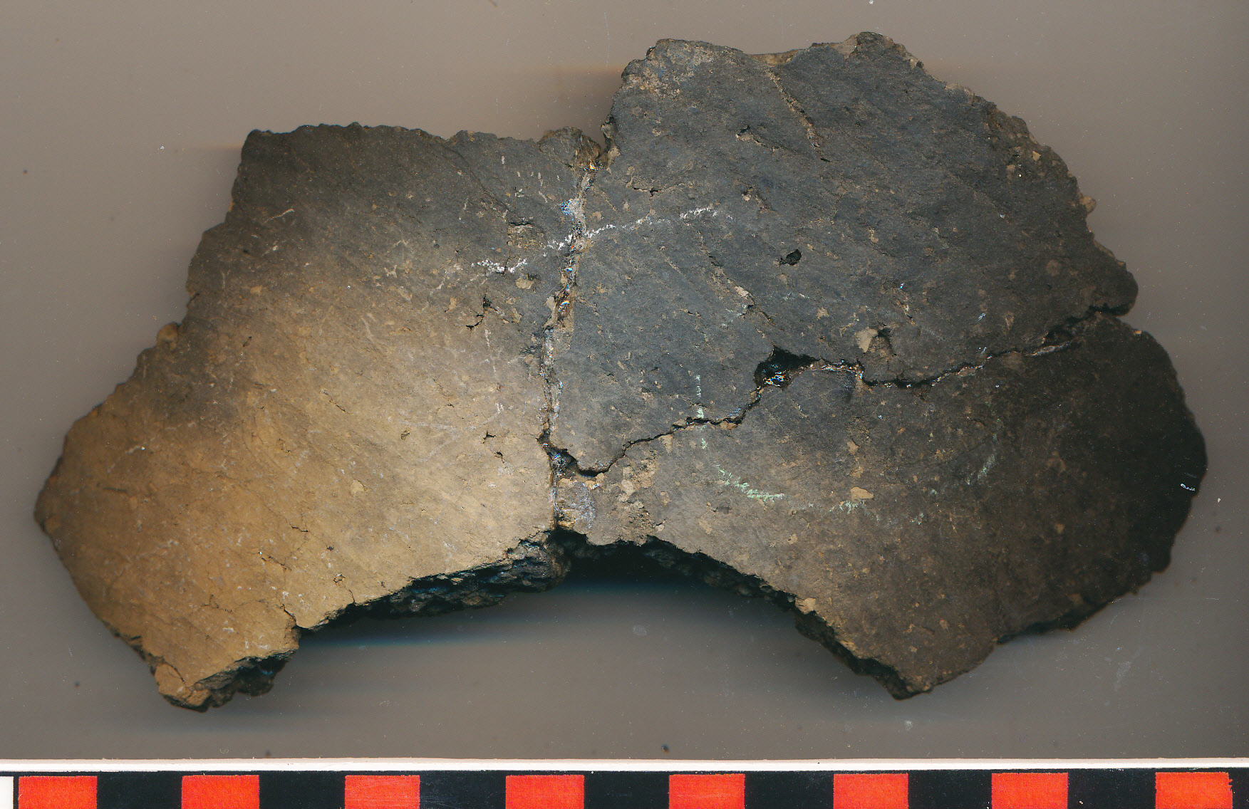 Kívül-belül elsimított felületű, fekete nagyobb edény kívül sárga foltos, világos kerámiazúzalékkal soványított oldaltöredéke 3 db-ból ragasztva.