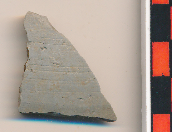 Világosszürke, korongolt, simított külső felületű, íves oldaltöredék a külső felületen korongolási karcokkal.