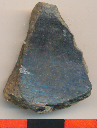 Fényezett fekete külső felületű, belsejében elsimított drapp, vékony falú kis edény enyhén kihajló nyaka, elvékonyodó peremmel. Összejött az előző töredékkel: összeragasztva ( a kettő együtt 2,7x3 cm).