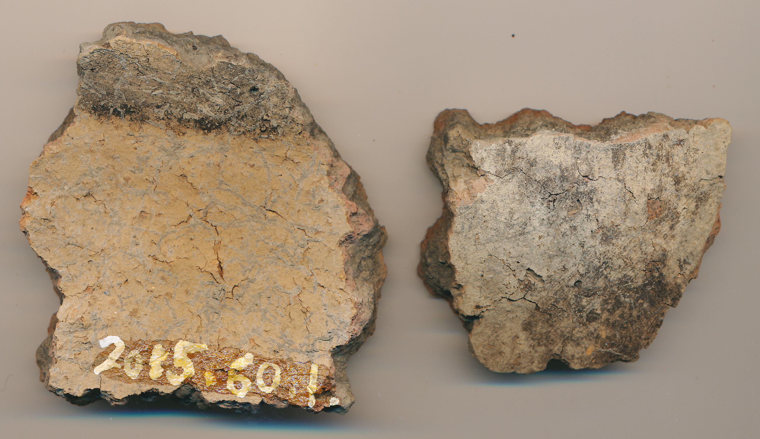 Kívül-belül téglaszínű, szürkésfekete törésű, kevés kerámiazúzalékkal soványított, korong nélkül készített edény két enyhén íves oldaltöredéke. Az egyik belsejében sávban kormos.