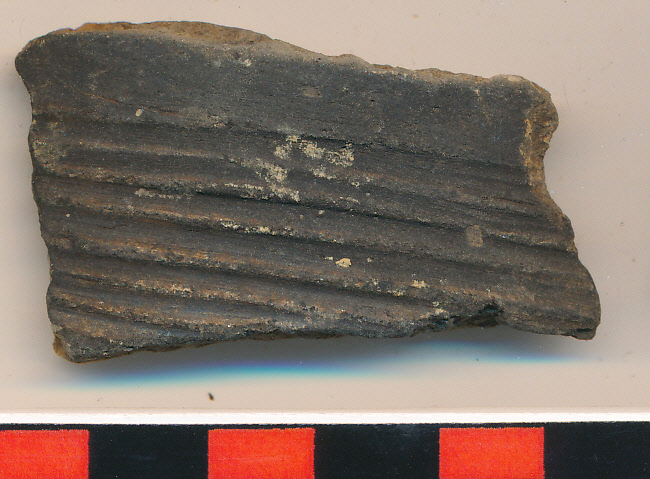 Kívül-belül elsimított,külsején fekete, sűrű, mély, keskeny, vízszintes hornyolással díszített enyhén íves nyak, a belsejében sárga.