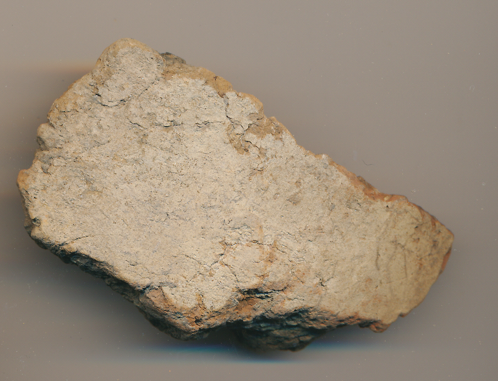Külső felületén téglaszínű, a belsőn szürke, fekete törésű, kevés kerámiazúzalékkal soványított, korong nélkül készített edény vastag falú, kissé íves oldaltöredéke.