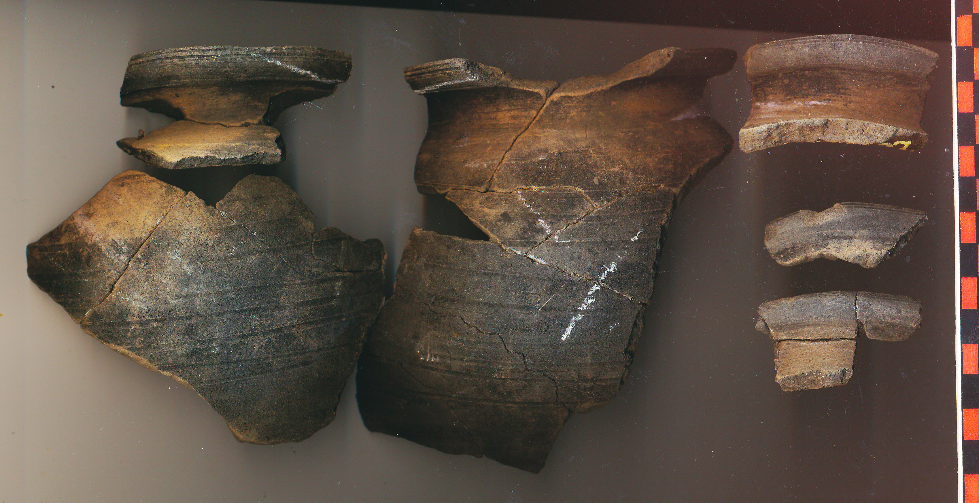 Fekete, sárga foltos, homokos anyagú, korongolt fazék erősen kihajló, kissé megduzzadt, aztán elvékonyodó peremmel, erősen íves nyakkal, a vállon 9 szabálytalanul körbefutó, szélesebb benyomott vonaldísszel. 16 db-ból ragasztott.