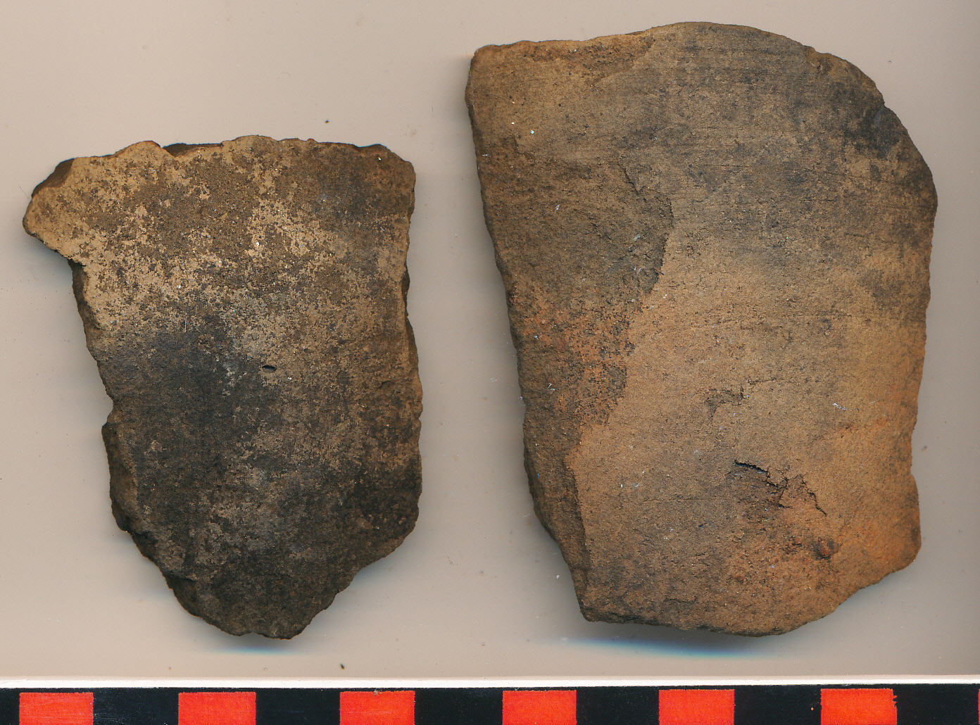 Fekete foltos téglaszínű külső felületű, fekete törésű, homokos anyagú, vastag falú edény 2 oldaltöredéke.