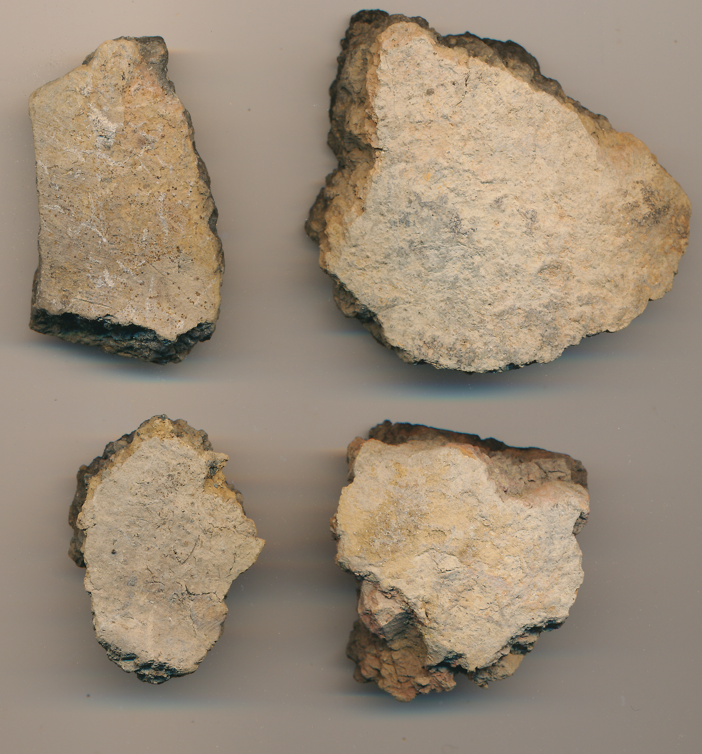 Téglaszínű külső felületű, fekete törésű, kerámiazúzalékkal soványított, korong nélkül készített, onlékony edények négy oldaltöredéke.