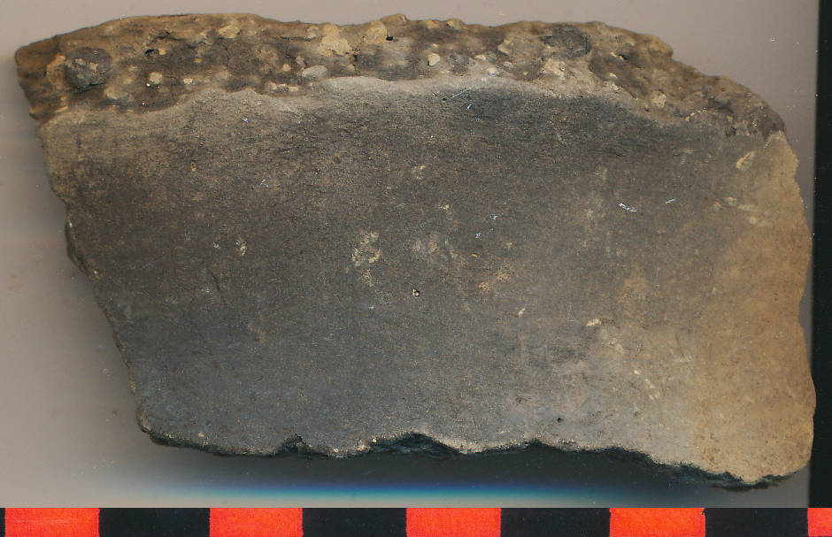 Drapp foltos sárga, eldolgozott külső, sárga elsimított belső felületű, szürke törésű, kerámiazúzalékkal erősen soványított, nagyobb edény enyhén íves nyaka.