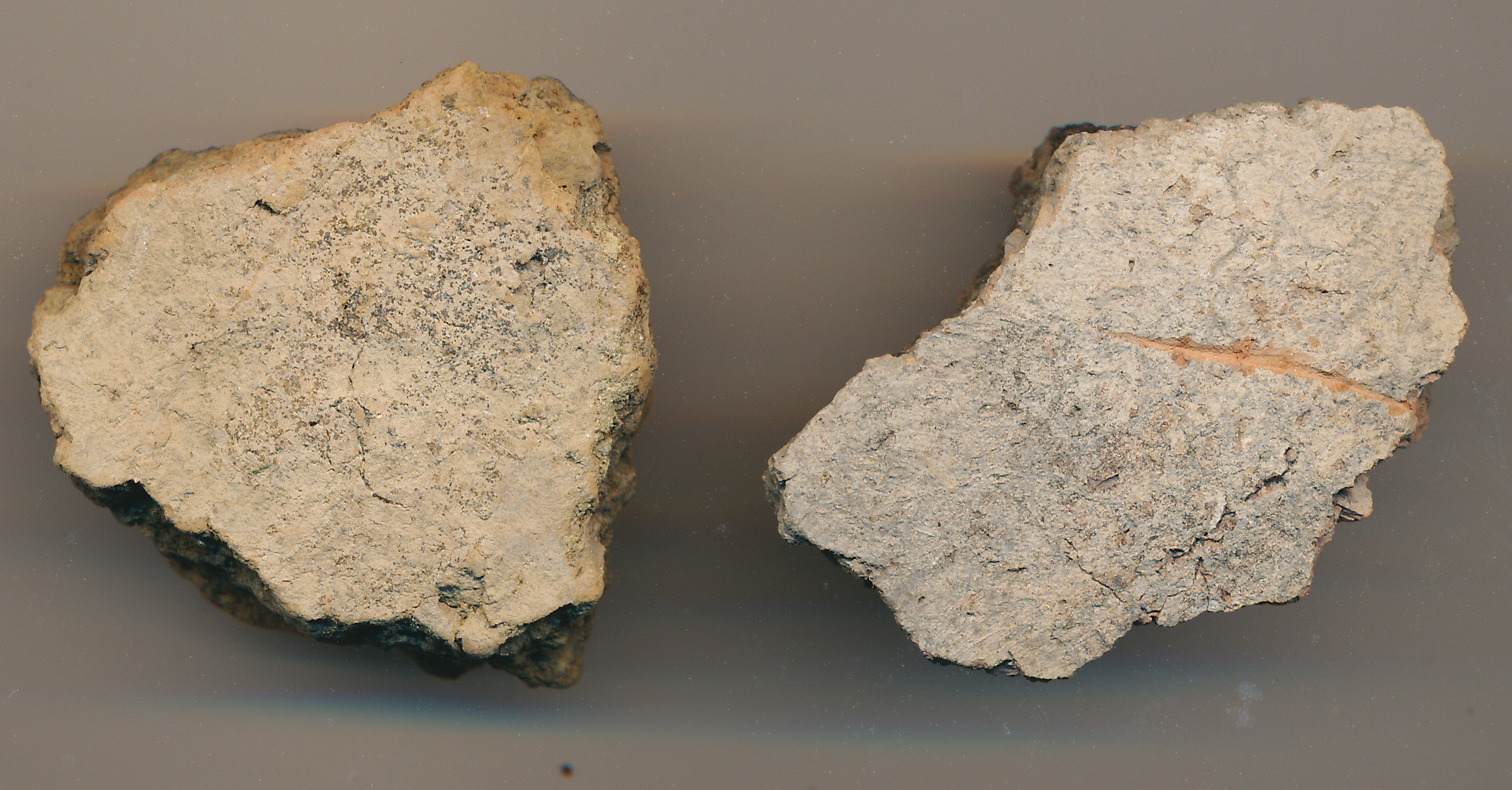 Kívül-belül szürkés drapp, szürkésfekete törésű, kerámiazúzalékkal soványított, korong nélkül készített edények 2 omlékonyabb oldaltöredéke. Az egyik belsejében kormos sáv látszik.