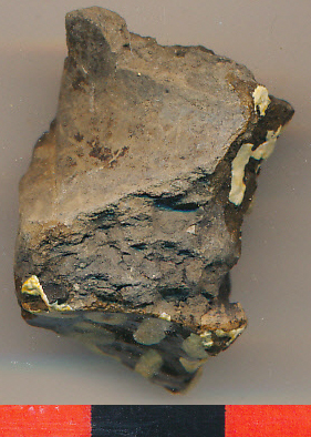 Fekete, belsejében fényezett, külsején simított szürke, kisebb edény talpgyűrű részének töredéke a felmenő fal egészen kis csonkjával, a talp pereme letöredezett.