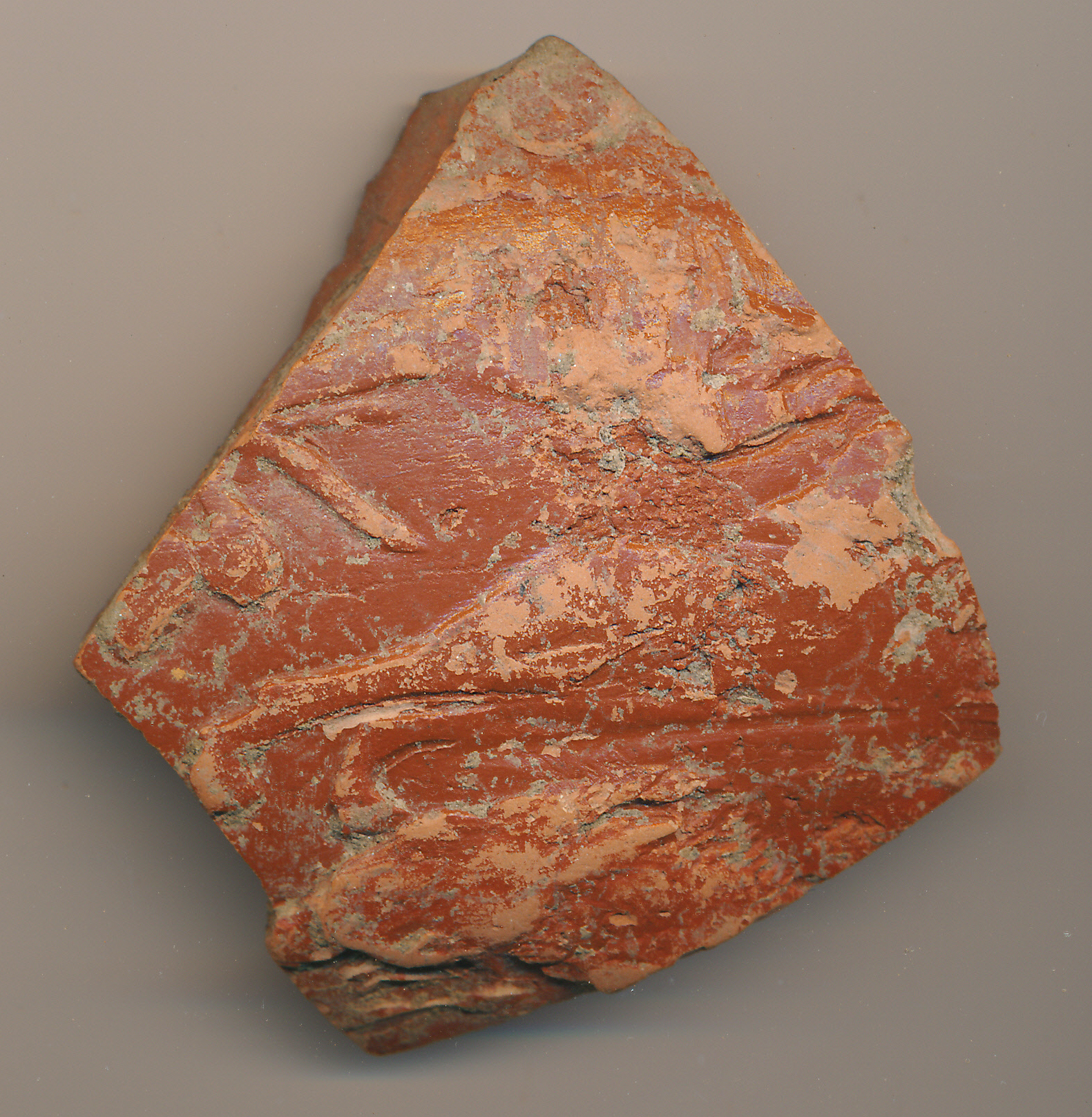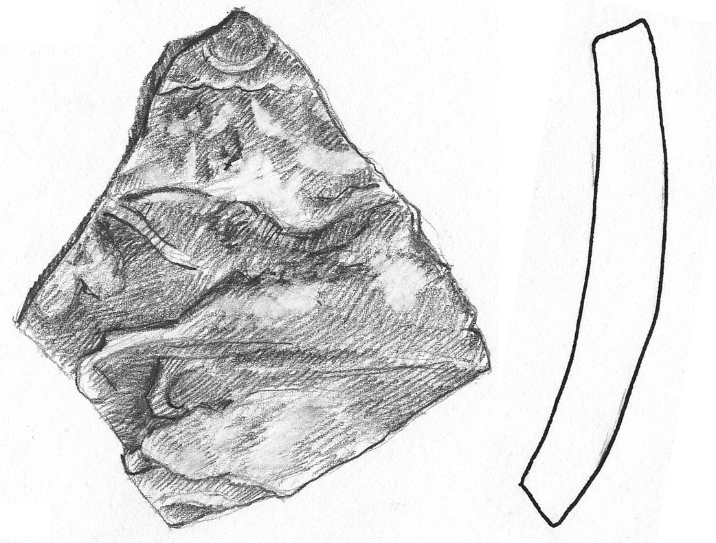 Drag. 37 típusú figurális díszű íves terra sigillata töredék. A tojásfüzér alatt valamilyen állattal ábrázolt jelenet alatt macskaszerű ragadozó 2/3 része látszik. Kopott. Közép-galliai, Antoninus kori, ún. "szabad stílusú" (Gabler Dénes meghatározása 2016. IV. 4.).