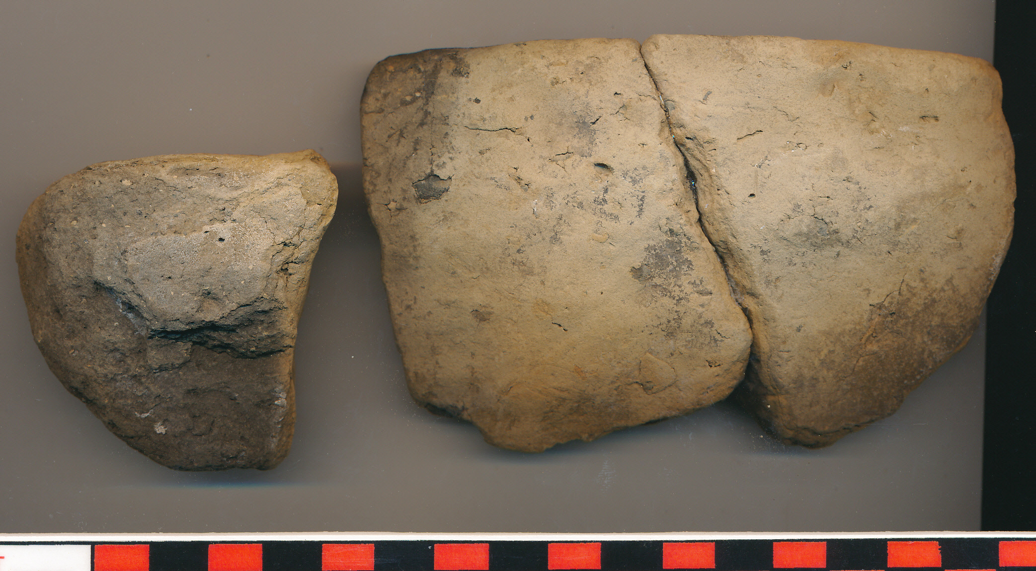 Sárga, szürke foltos, helyenként fekete törésű, durva kidolgozású, kevés kerámiazúzalékkal soványított, vízszintesen levágott peremű lapos, alja felé kissé öblösödő, vágott aljú edény (esetleg hordozható tűzhely?) 2 töredéke. Talán az előző edény részei. Az egyik 2 darabból ragasztott.