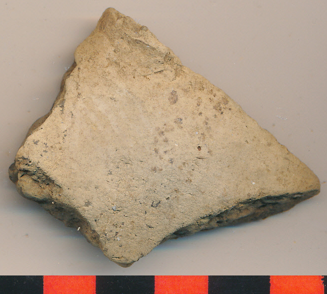 Eldolgozott sárga külsejű, sötétszürke törésű, kisebb, vastagabb falú edény íves hastöredéke fül vagy bütyök indításának töredékével.