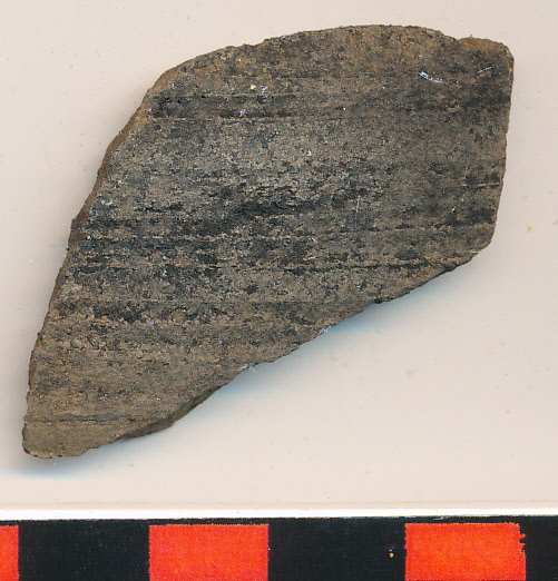 Fekete koromfoltos sötétszürke, homokos anyagú, korongolt oldaltöredék sűrűn benyomott, közepesen széles körbefutó vonalakkal.