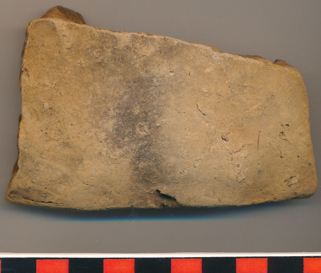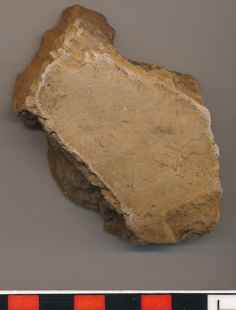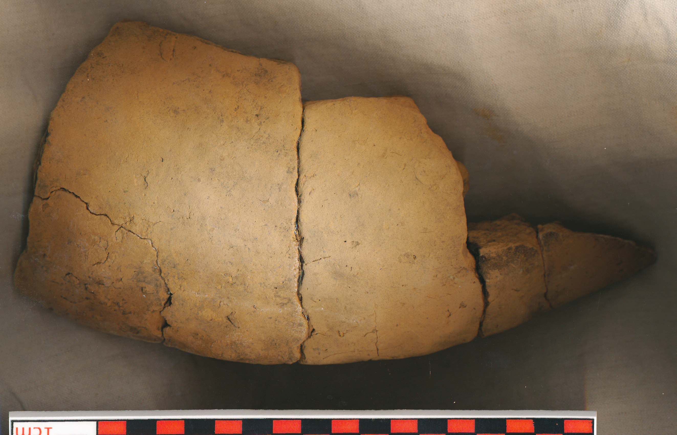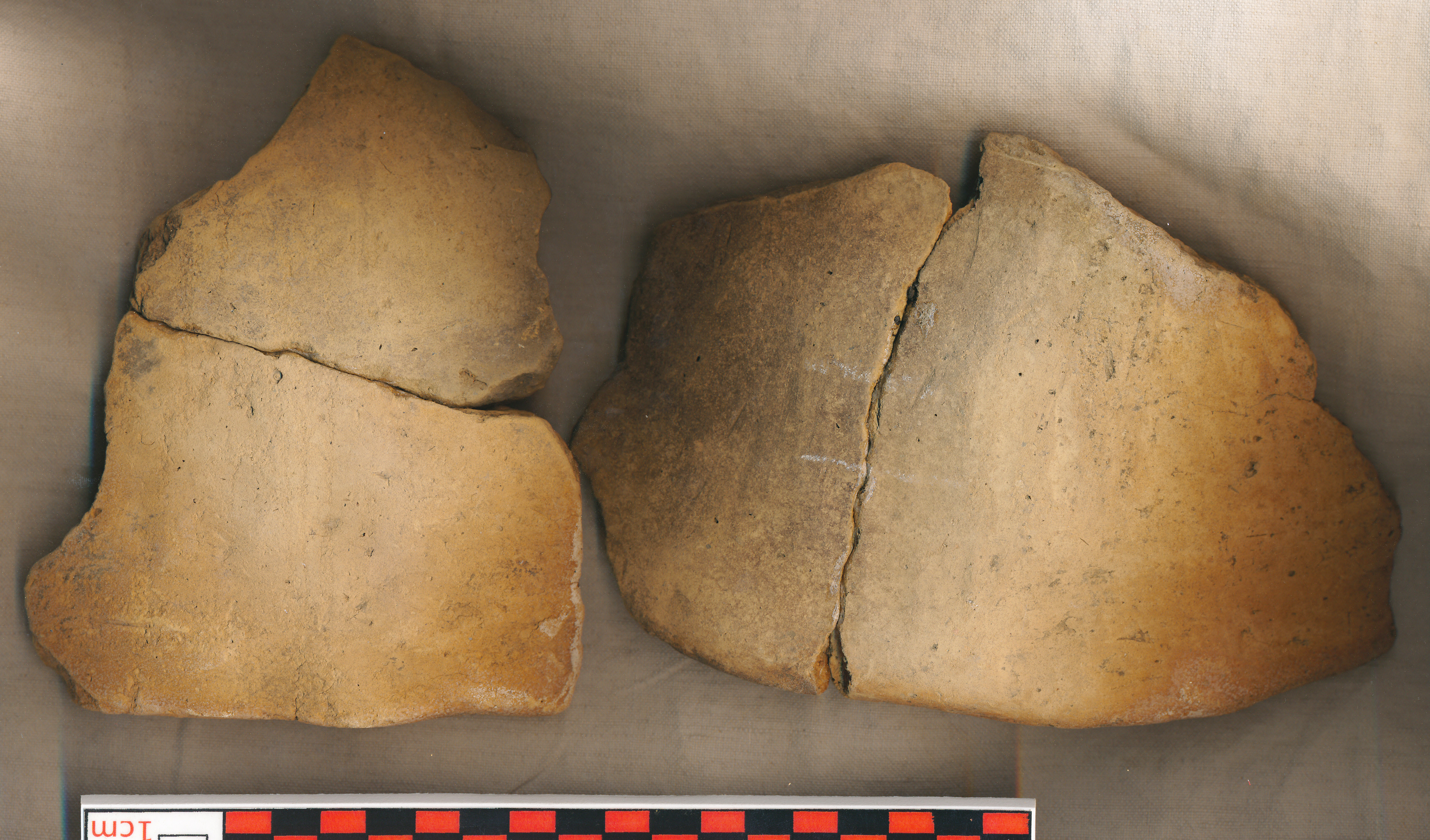 Téglaszínű, durva kidolgozású, kevés kerámiazúzalékkal soványított, legömbölyített peremű íves falú edény (esetleg sütőharang?) 4 töredéke. 2-2, illetve 5 darabból ragasztott.
