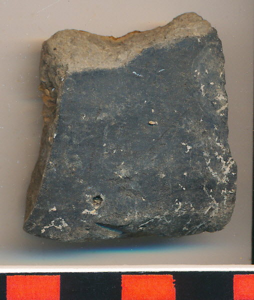 Fényezett fekete külső felületű, belsejében világosszürke, sötétszürke törésű edény oldala a legömbölyítve induló vágott alj indításával.