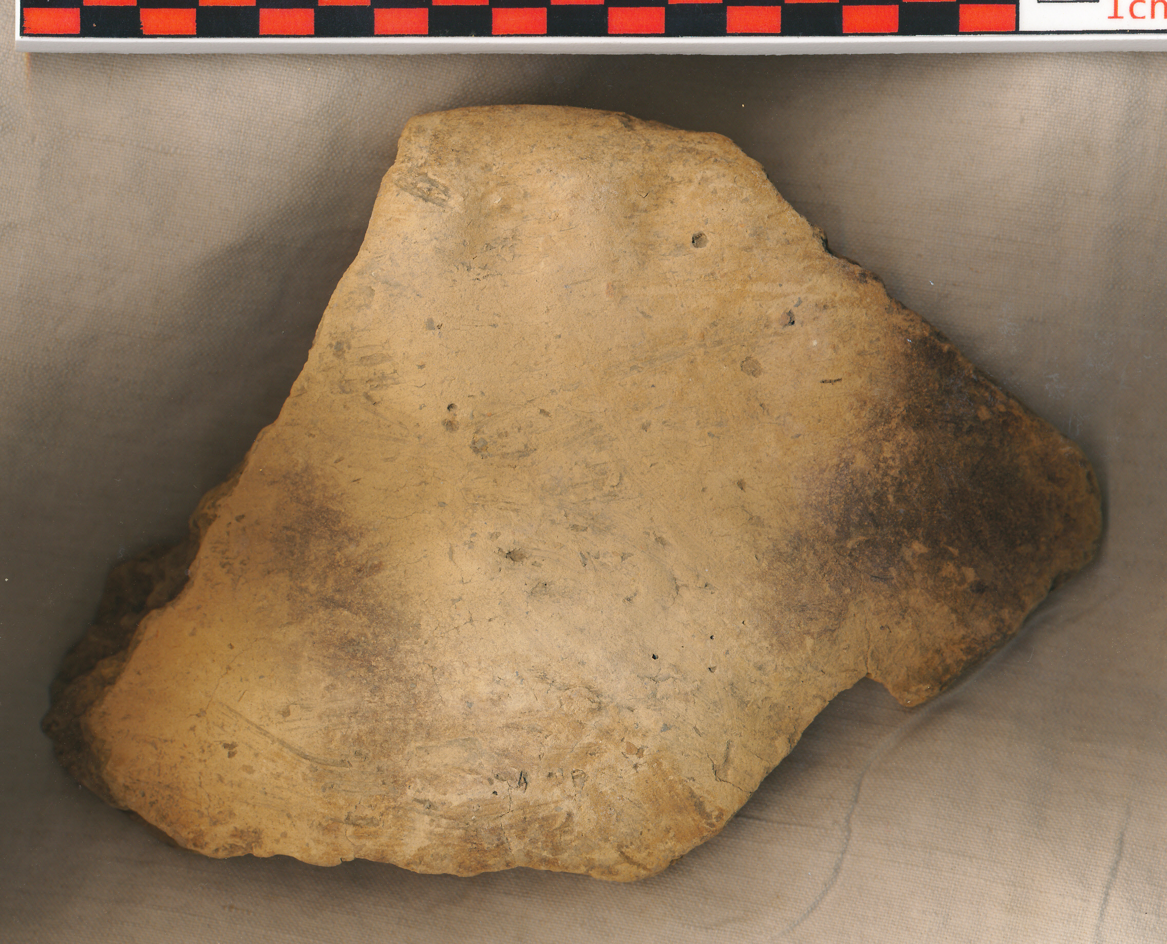Téglaszínű, helyenként koromfoltos, durva kidolgozású, kevés kerámiazúzalékkal soványított, enyhén behúzott peremű, íves falú edény (esetleg sütőharang?) töredéke.