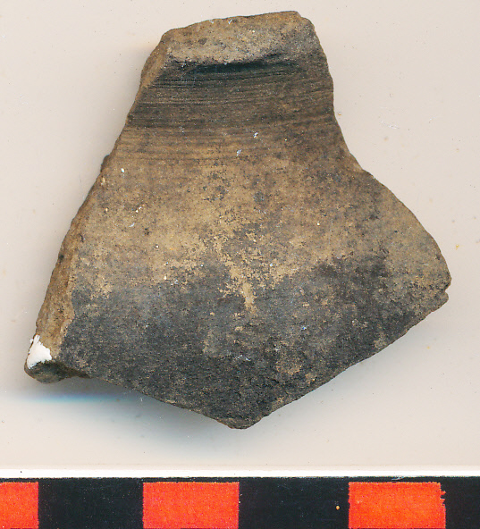 Fekete, kívül sárga foltos, kevés homokkal soványított anyagú, korongolt válltöredék az íves nyak indításával.