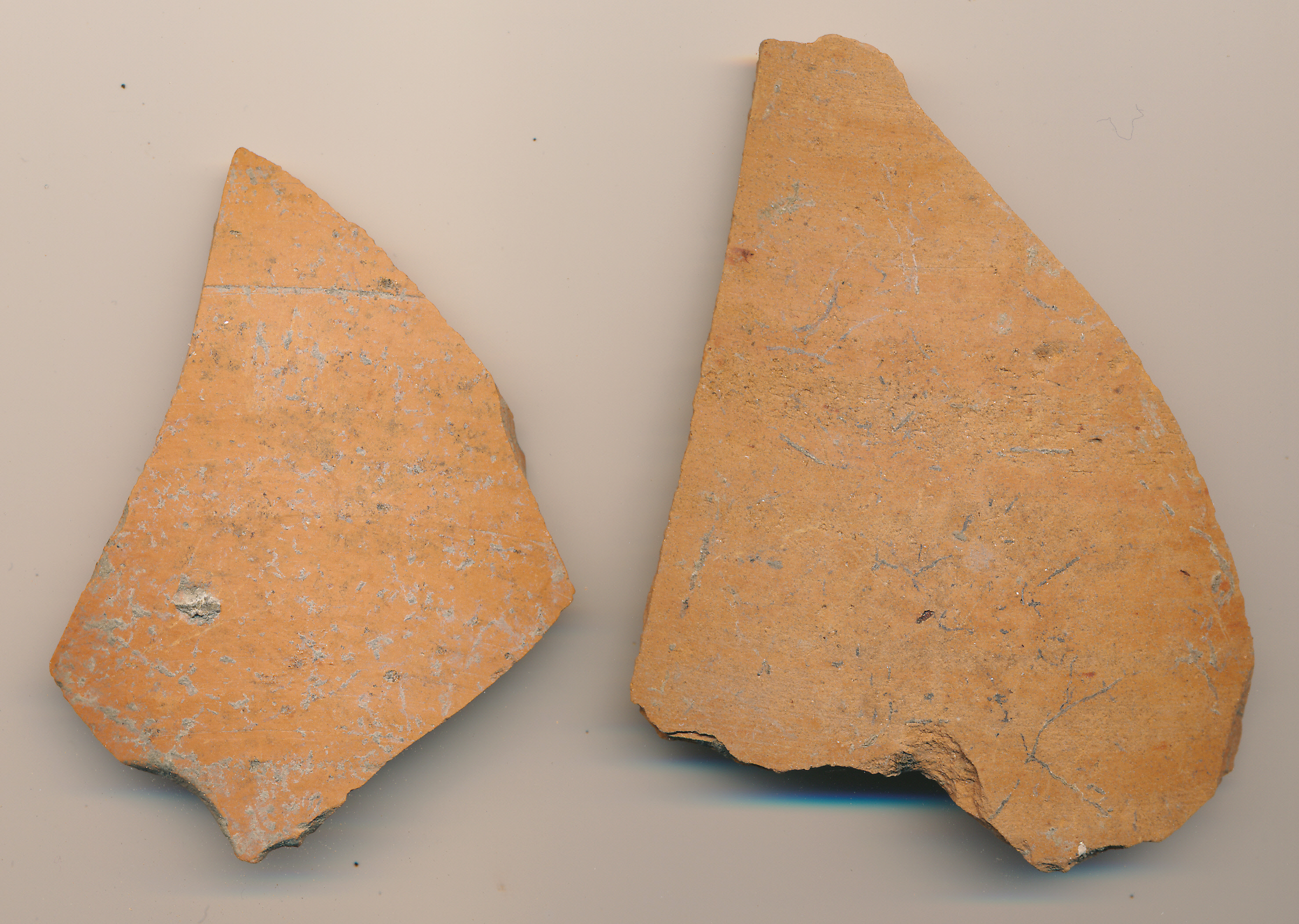 Téglaszínű, külső felületén simított, korongolt nagyobb edények két vékony falú oldaltöredéke.
