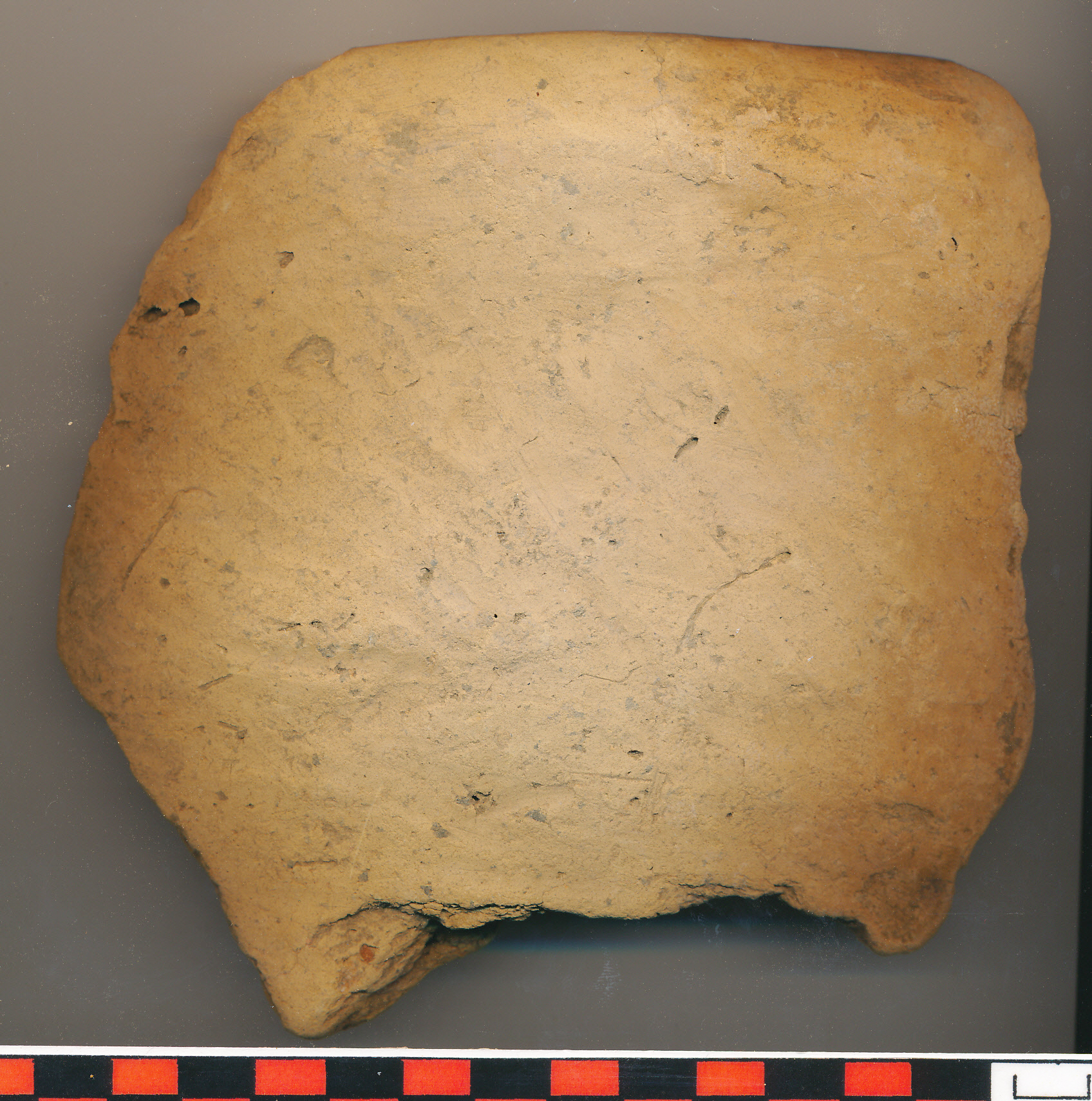 Téglaszínű, durva kidolgozású, kevés kerámiazúzalékkal soványított, enyhén behúzott peremű, íves falú edény (esetleg sütőharang?) töredéke. Belül némileg eldolgozták. Lehet, hogy az előző edény töredéke.