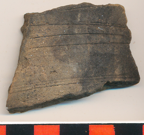 Fekete koromfoltos sötétszürke, nagyon kevés homokkal soványított anyagú, korongolt oldaltöredék szabálytalanul körbefutó karcolt vonalakkal.