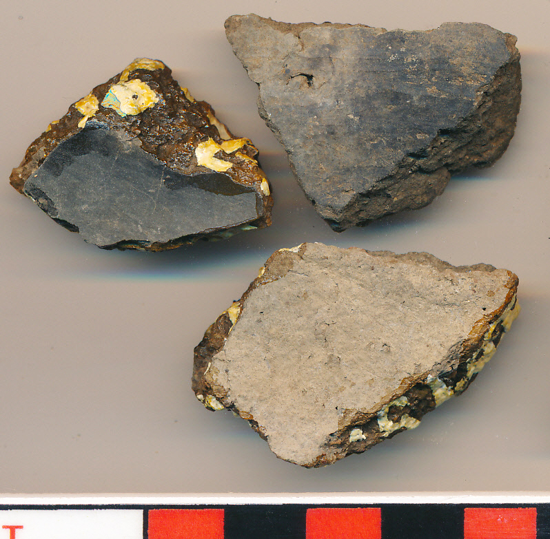 Belsejében fényezett fekete, vékonyabb falú edények 1téglaszínű, 1 fekete foltos drapp és 1 sárga külső felületű oldaltöredéke.