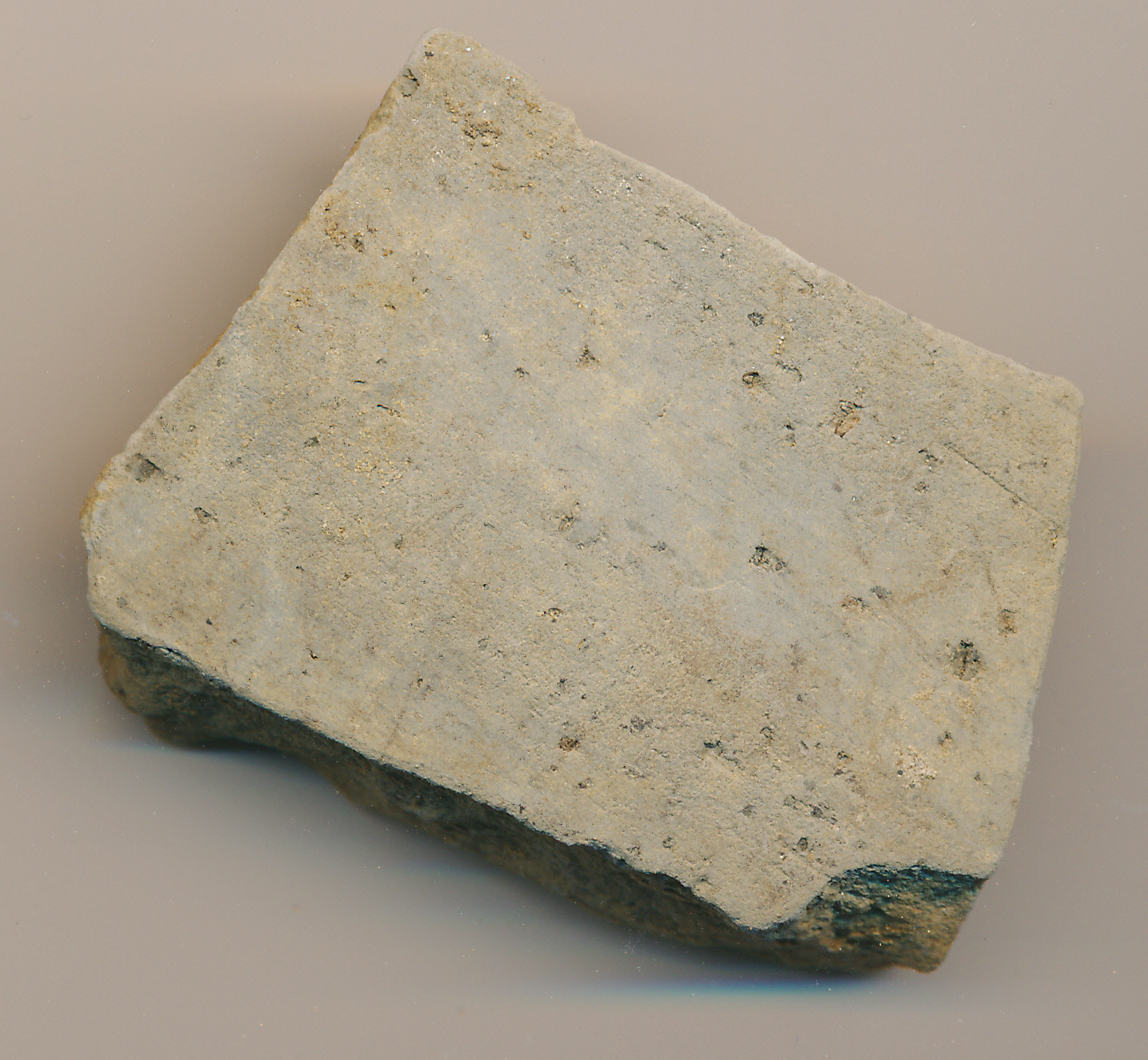Világosszürke, külső felületén simított, korongolt, nagyon vastag falú edény oldaltöredéke.