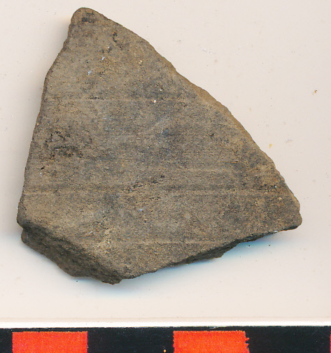 Sötétszürke külső felületű, fekete törésű, nagyon kevés homokkal soványított anyagú, korongolt oldaltöredék szabálytalanul körbefut, egészen sekélyen karcolt vonalakkal.