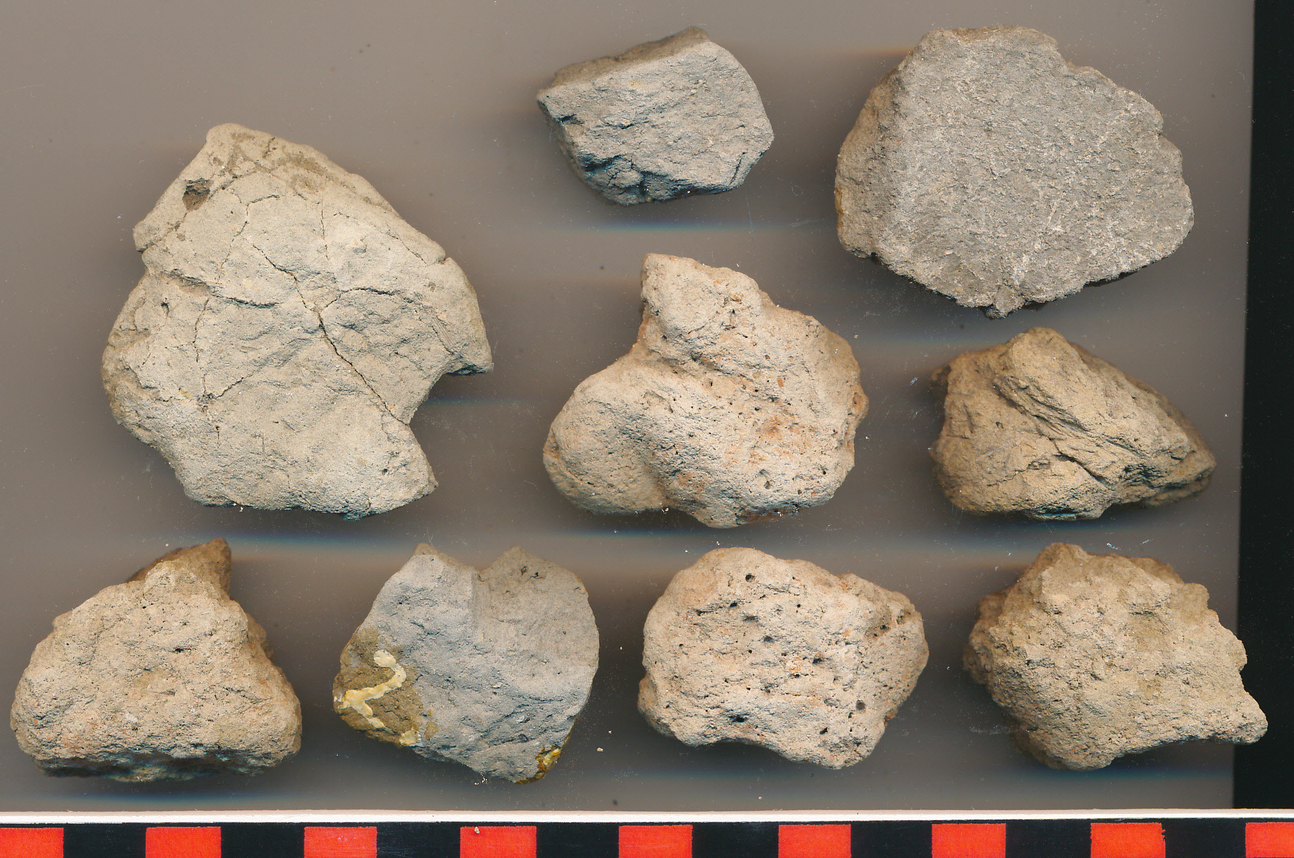 Sárgásfehér, szabálytalan alakú, homokos anyagú, morzsolódó tapasztásrög.