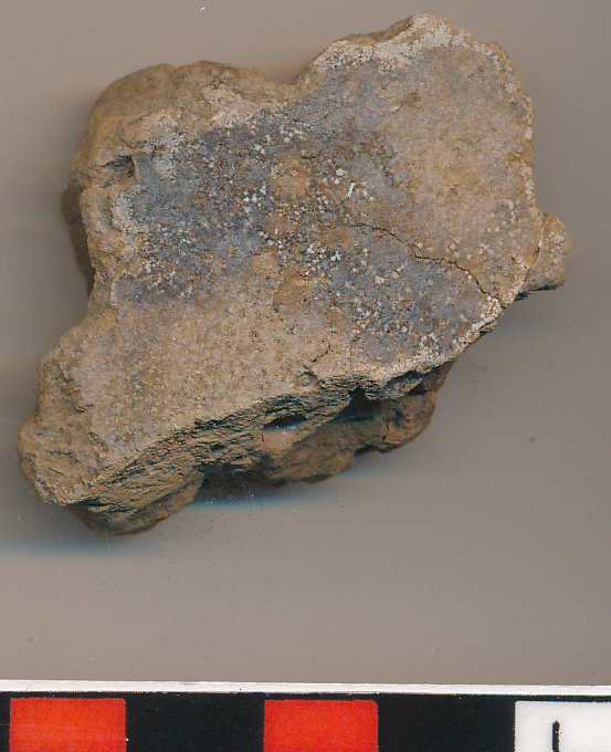 Téglaszínű, kívül-belül koromfoltos, külsején másodlagosan égett, durva kidolgozású, kevés kerámiazúzalékkal soványított, vastag falú nagy edény - valószínűleg a 2015.111.1-5 edények egyike - oldaltöredéke.