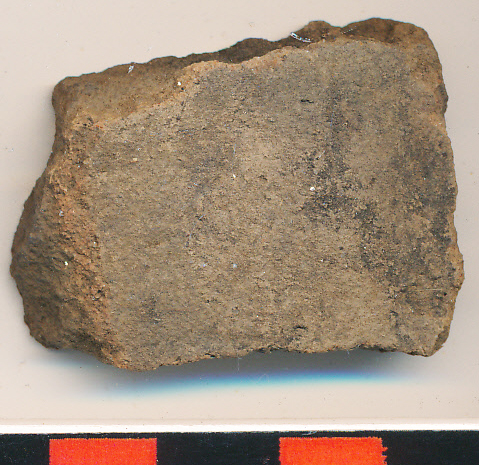 Piszkosbarna külső felületű, sötétebb, feketés törésű, homokkal soványított anyagú, korongolt oldaltöredék.