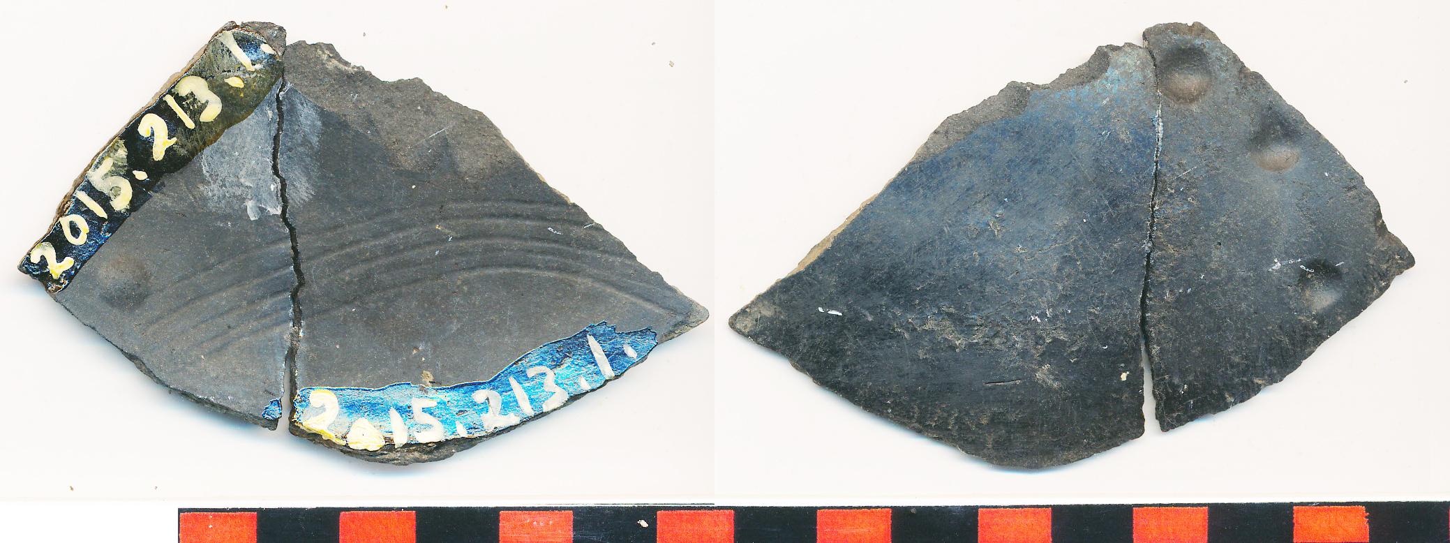 Fekete, kívül-belül fényezett, nagyon vékony falú tál oldaltöredéke, kívül 3 benyomott kör alakú díszből egy ívet képeztek, mellettük még egy ugyanolyan dísz indítása látszik. A belsejében 4 sekélyen bekarcolt vonalból álló köteg fut körbe. 2 db-ból ragasztott.