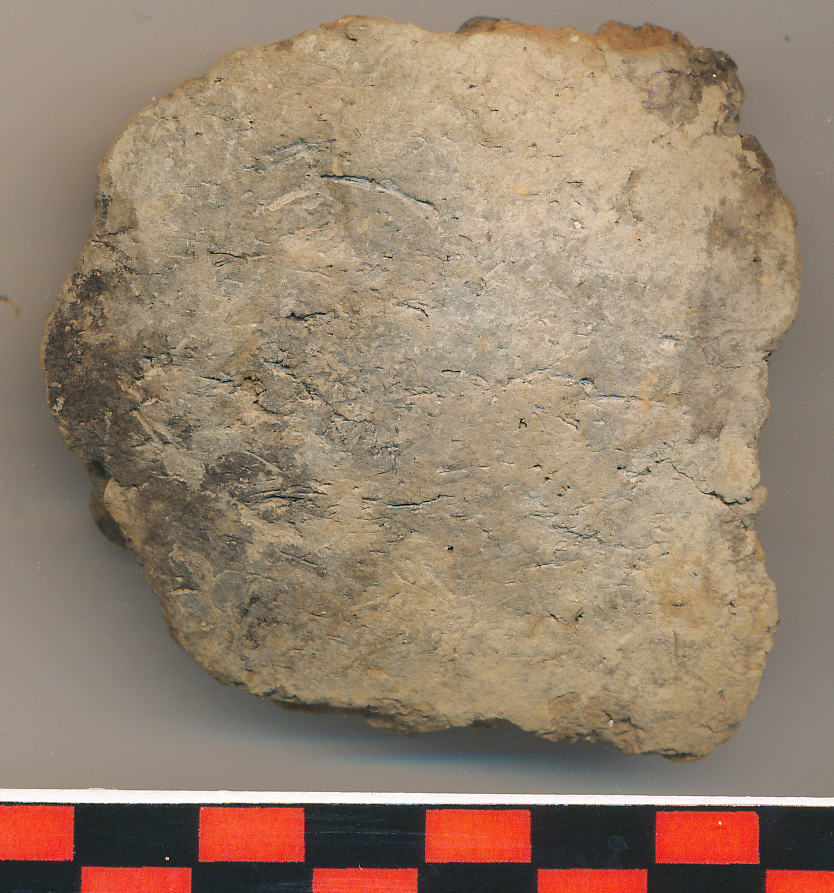 Szürke külső-belső felületű, téglaszínű foltos, fekete törésű, korong nélkül készített, kerámiazúzalékkal soványított, eldolgozott felületű, vastag falú íves oldaltöredék.