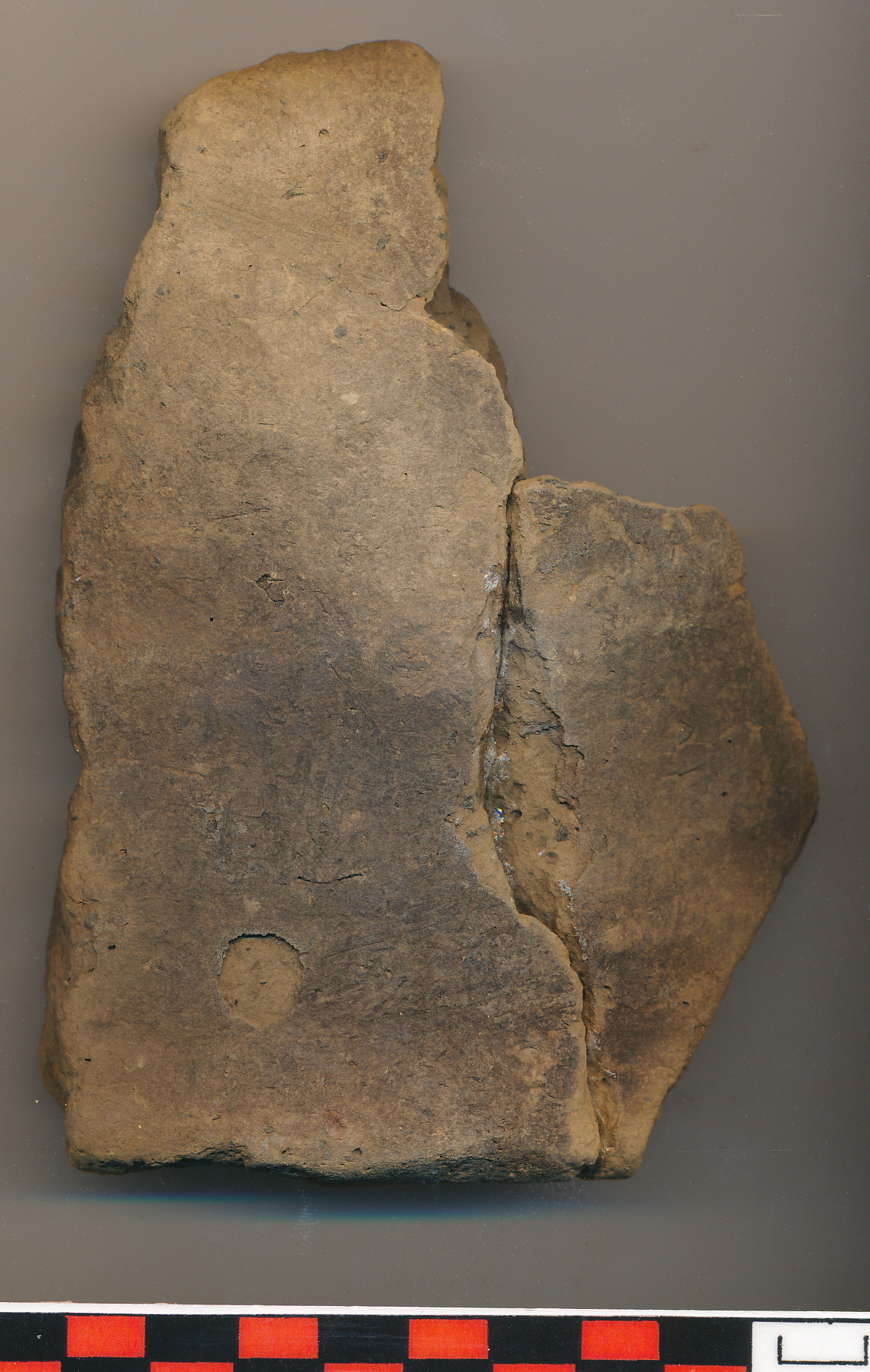 Sárga, szürke foltos, korong nélkül készített, kevés kerámiazúzalékkal soványított, vasrag falú, durva kivitelű nagyobb edény kissé elvékonyodó, legömbölyített pereme és egyenesen, meredeken induló oldala. Esetleg sütőharang? 2 db-ból ragasztott. Törése sajátos: mintha dupla falat dolgoztak volna össze.